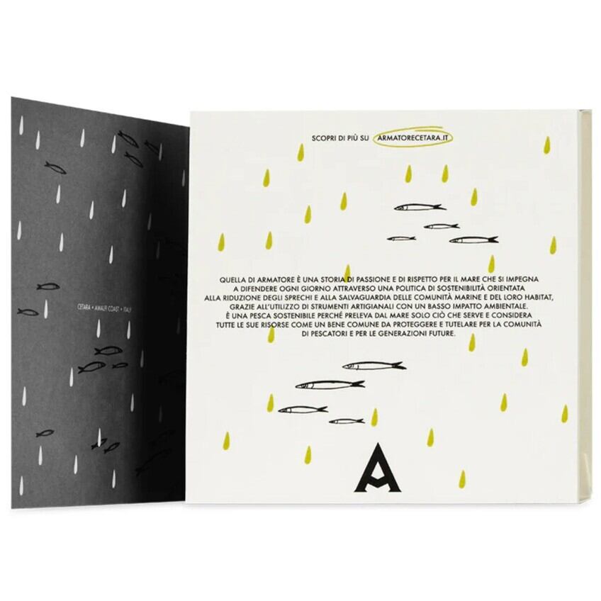 ARMATORE社はカンパーニア州のアマルフィコーストという海岸線にある港町・チェターラになります。チェターラは昔から漁業の町であり、イタリアの魚醤・コラトゥーラ・ディ・アリーチの発祥の町としても有名です。ARMATORE社の拘りのポイントは自らの船で獲れた魚のみを使用し、冷凍ものや仕入れてきた魚は一切使わないというところです。アンチョビやコラトゥーラ・ディ・アリーチの原料はイワシと海塩のみ。だからこそイワシの鮮度が味のほとんどの要素を占めています。海と共存することを目的とした考えで自らに禁漁期間を設定し、カタクチイワシは3月15日~10月15日まで、大西洋クロマグロに至っては5月25日~6月30日までしか獲っていません。網にも独特な工夫を施し、目的の魚以外は海に帰し、海の資源を守ることも自らの大切な役割との考え方のもとで仕事をしています。チェターラという港町の伝統、大切な海の資源との共存方法、サステナビリティに特化した漁法やパッケージ。すべてを次世代に繋ぐ強い意志のもとで仕事をする事で結果的に他社の製品とは明確な味の違いを生み出します。